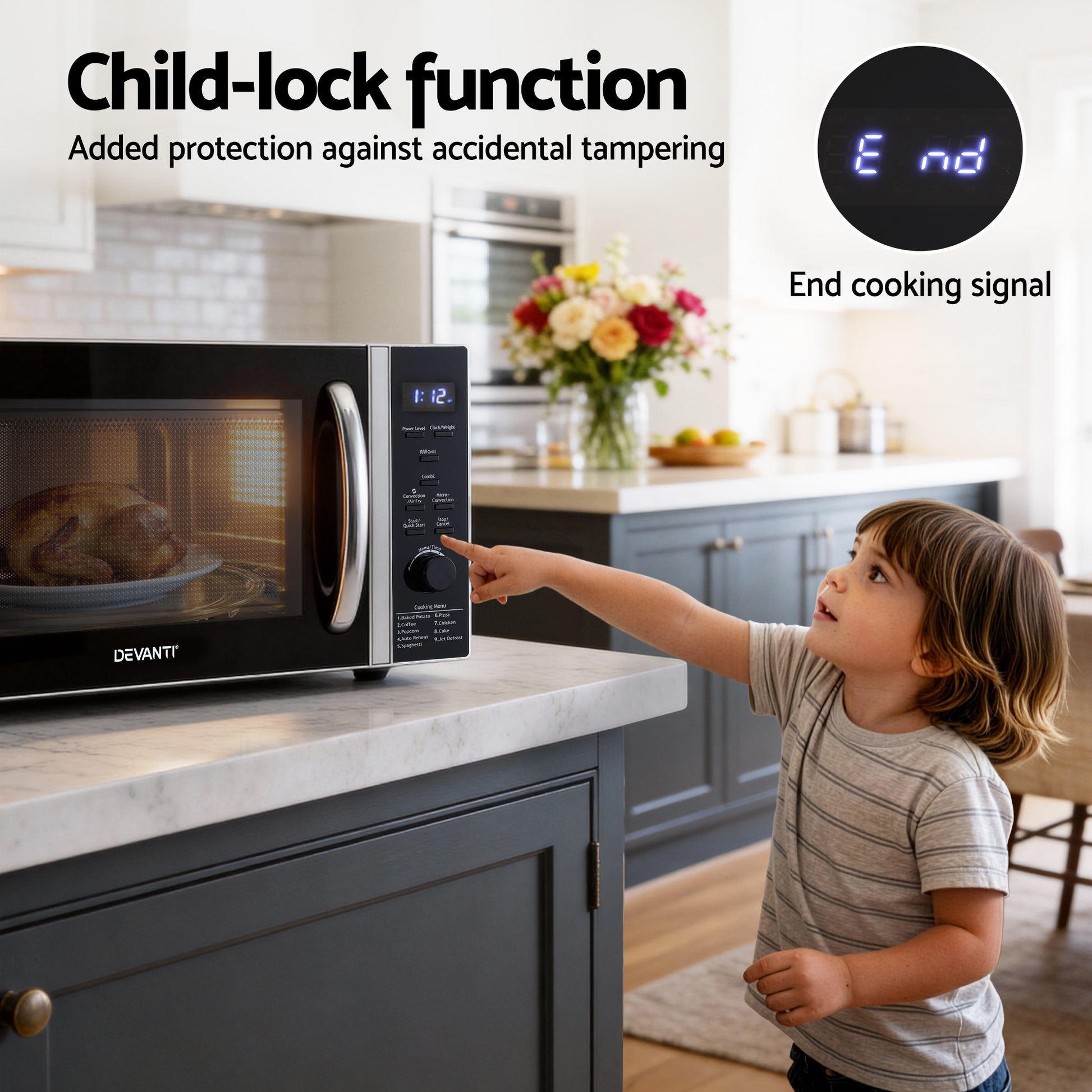 Transform your kitchen with the versatile Devanti 4-in-1 Microwave. Combining Microwave, Air Fryer, Grill, and Convection technology, this digital all-in-one cooker features 10 power levels and 9 auto menus for effortless meals. View settings on the clear LED screen and defrost easily by weight or time. Designed with a stylish pull door and child safety lock, it comes complete with a glass turntable, high grill rack, and low baking tray to master roasting and baking in one compact unit.