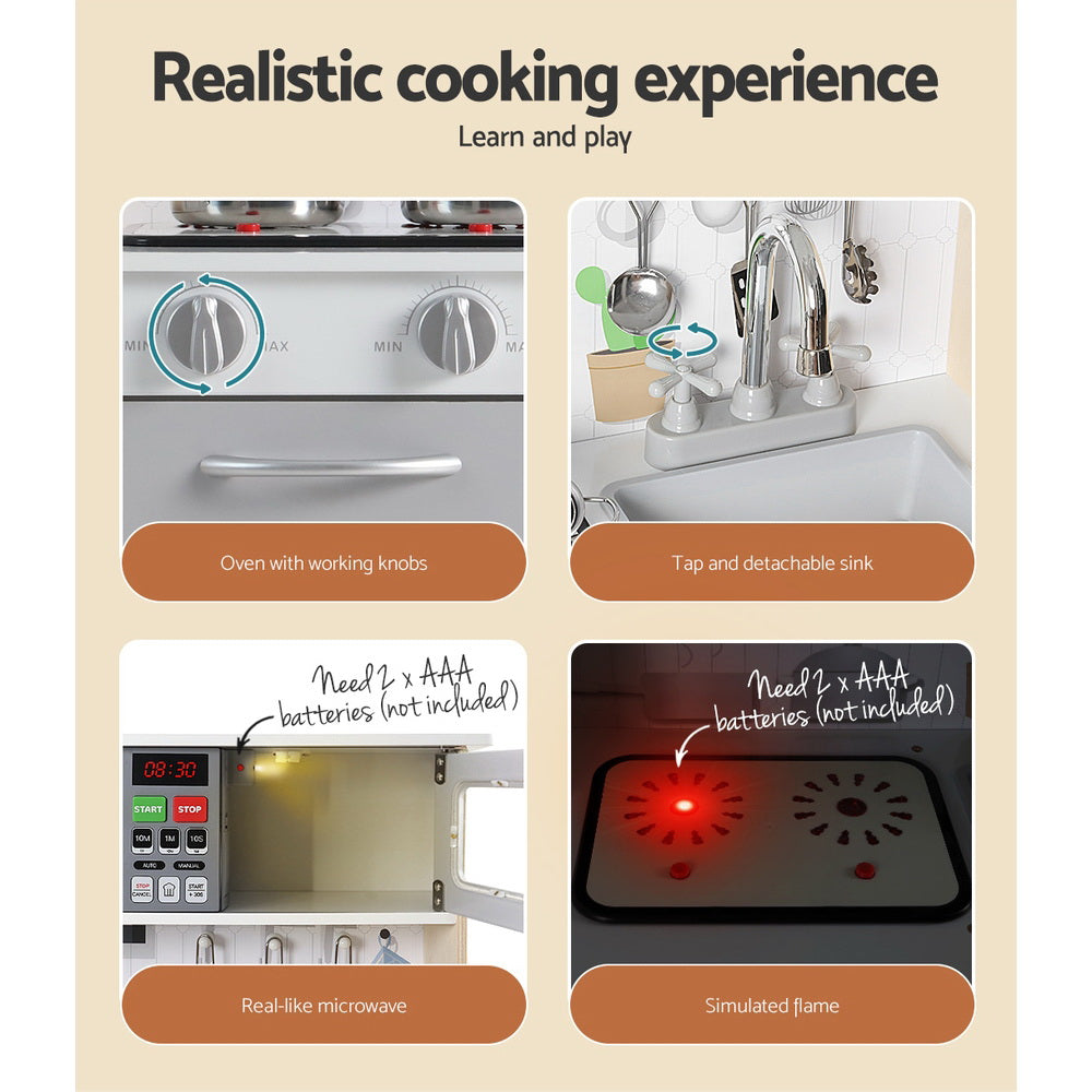 Every little aspiring chef needs their kitchen set! Let your little ones have fun cooking with our Keezi fully equipped modern kitchen play set. Our kitchen set comes with all modern kitchenware and appliances, such as a realistic rangehood with lights and fan, microwave, handy pegs, storage space, tap and removable sink, stove top and play pots, oven with working knobs and door, and cooking utensils for a real-like cooking experience. Made from a combination of solid wood and MDF, the kitchen set is sturdy and durable. It comes with safety and quality approval and non-toxic paint finish for your childβs safety. Now your young chefs can develop several basic life skills all while cooking and serving delicious meals for you. Go and get your kids in the Keezi kitchen today.